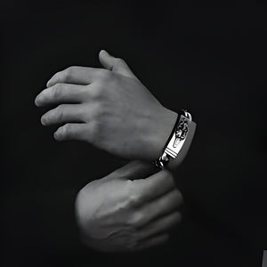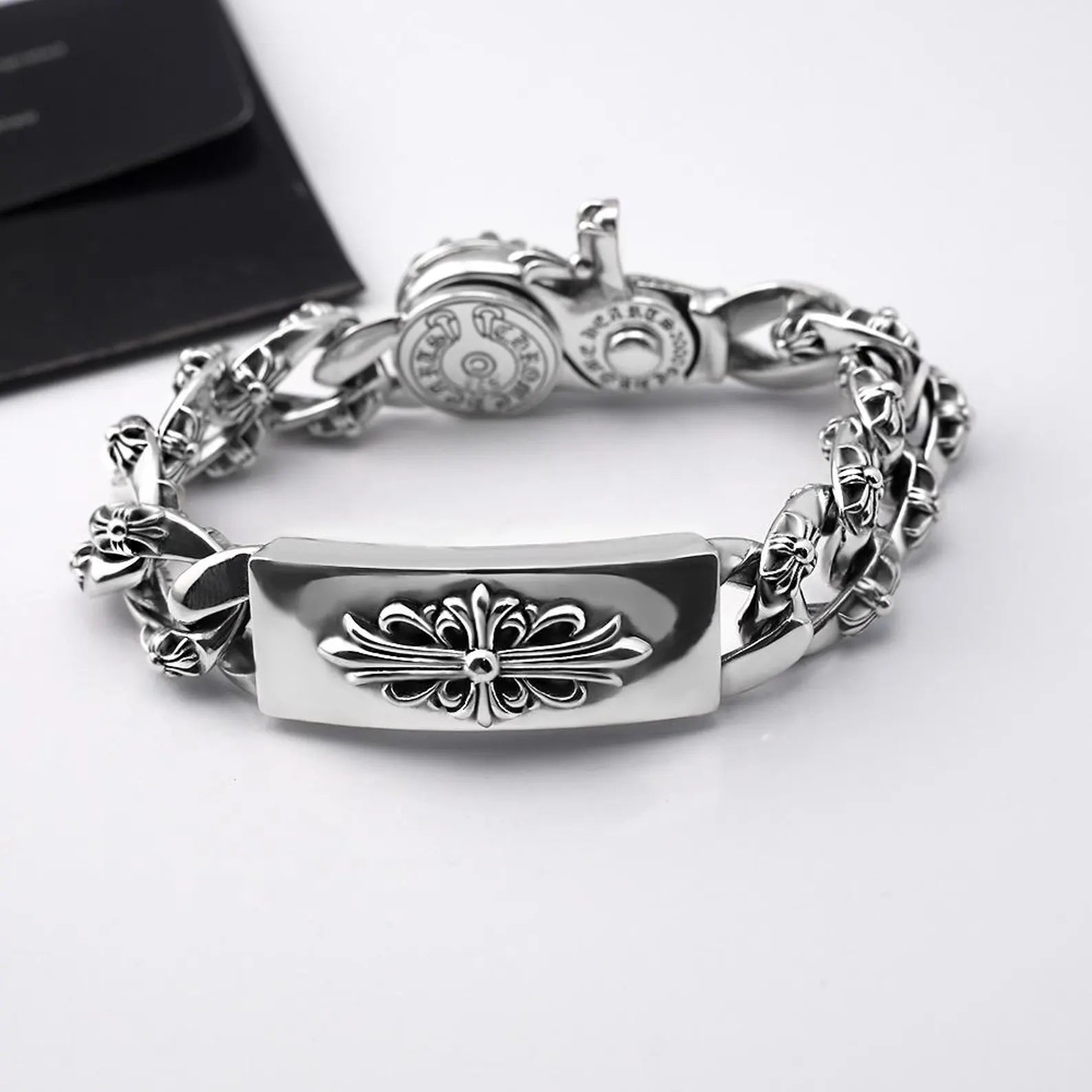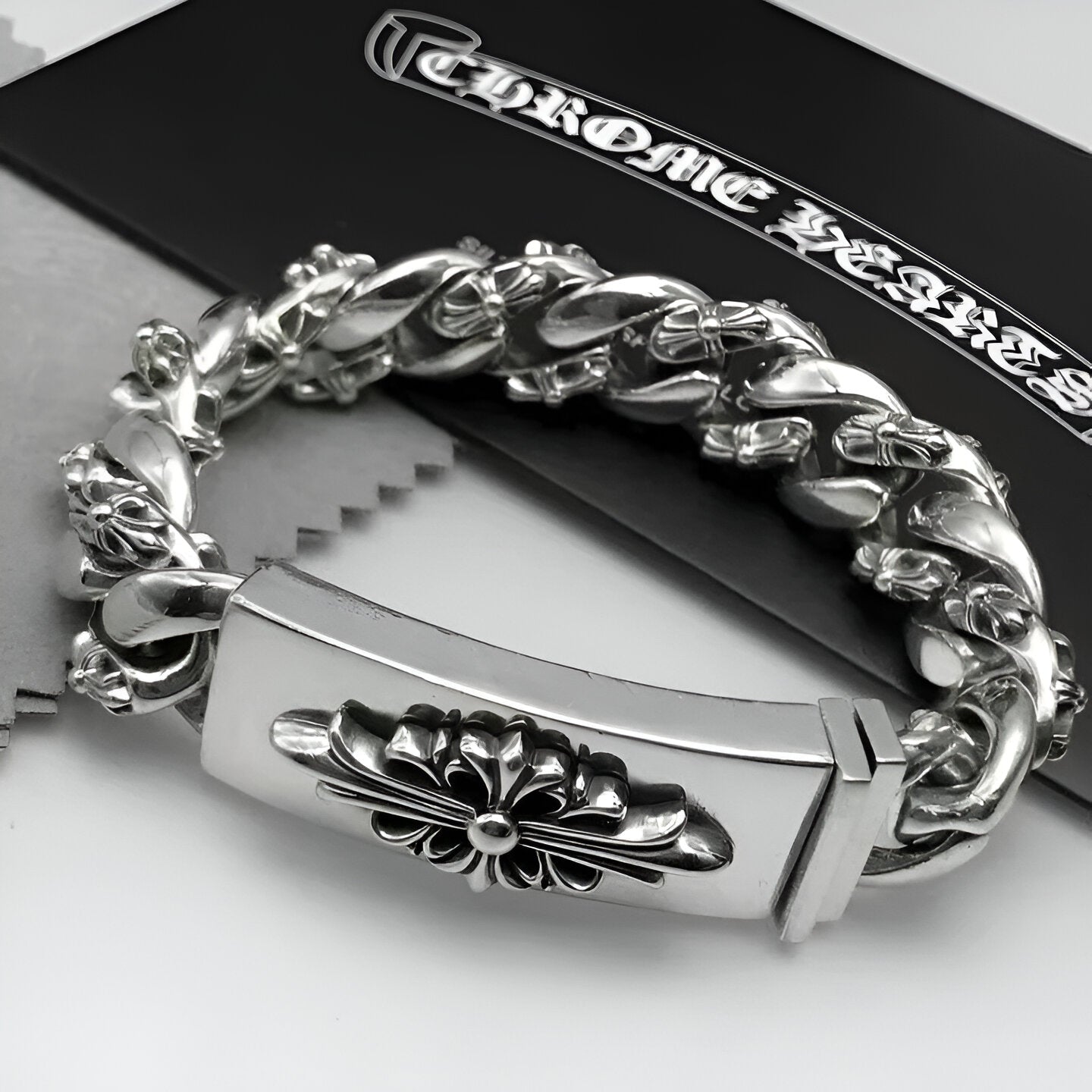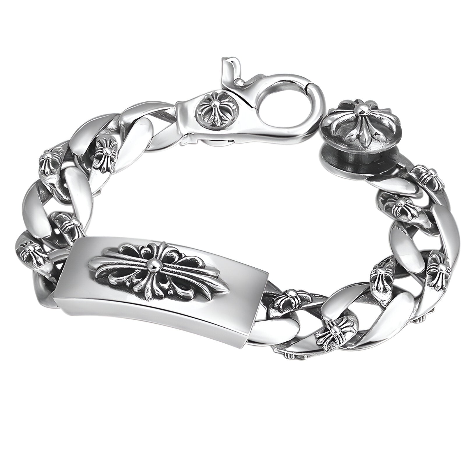 The Bold Chrome Bracelet is a defiant fusion of raw cross motifs and a rugged Cuban band. Its striking design exudes boldness and individuality, making it the perfect statement piece for those who refuse to blend in. Available in multiple lengths for an ensured, desired fit.