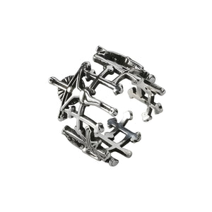 The Crucifix Ring is a bold manifestation of devotion and design. Featuring an array of crucifix engravings banded together, it forms a seamless silver ring that radiates both reverence and edge. A one size fits all, finished with a polished silver sheen, this piece merges faith with statement styling.