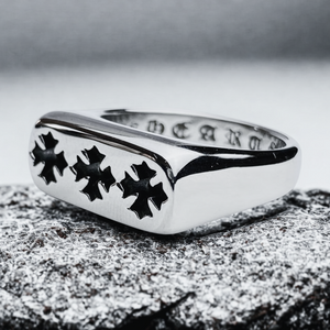 The Triple Crossed Ring brings together three overlapping motifs that loop around in unison—each one echoing a symbol of strength, resilience, and relentless style. With its layered cruciform design, this piece stands as a bold emblem of devotion to the culture.